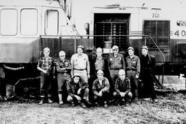 Photograph depicts group of ten men standing and kneeling in front of BE 40R blasthole drill in mine area. For names of individuals, see similar image, item 2000.1.1.3.19.72.