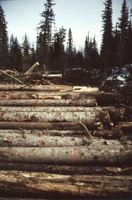 Marked-to-cut trees in log pile, Summit Lake Selection Trial