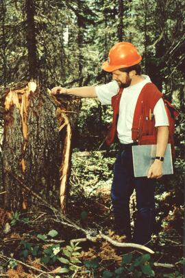 Michael Jull identifying blowdown due to tomentosus butt rot, Summit Lake