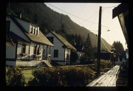 Image depicts small row houses, believed to be staff housing at North Pacific Cannery (southeast of the main cannery building).