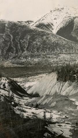 Photo depicts a river valley with tall, rounded, treed mountains with snow on the peaks and in the ridges and runnels. A gully takes up the foreground of the photo, maybe caused by a landslide or by glacial retreat. Sandy cutbanks, skinny trees, and snow line the gully or ravine.