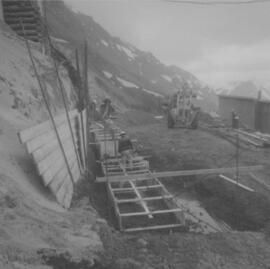 standing in forms for cement laid against mountain wall on high elevation of construction site. A retaining structure made with wood planks and rebar separates mountainside dirt from cement forms. A front end loader can be seen in midground, near unidentified building. Mountain range in background.