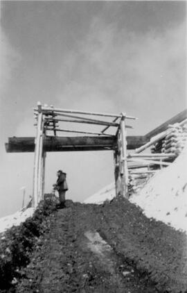 Photograph depicts log structure supporting chute believed to be part of ore gravity chute. Man under structure, mountain switchback road in foreground.