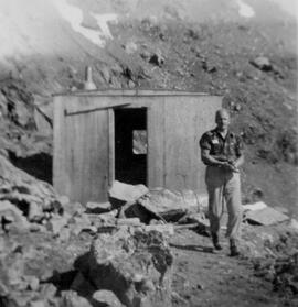 Photograph depicts man at small wooden structure, miscellaneous industrial material in front of building. Rocks in foreground, mountainside in background. Corresponding note on accompanying photo description page: "8. Mine shelter on talus deposit. Mr. Gordon Little in foreground."