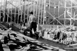 Photograph depicts man pushing wheelbarrow in framed building believed to be mill or power house. Wood planks in foreground, man and mountains in background.
