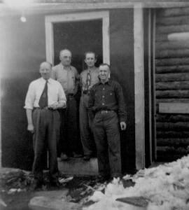 Photograph depicts four men in business attire (two wearing ties) in doorway of log office building. Pile of snow in foreground on right. Corresponding note on accompanying photo description page: "6. In front of office; L. to R. Duncan, Hood, Ward, Jenkyns." It is believed that these men may be staff members.