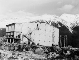 Photograph depicts mill building. Rocks in foreground, mountains in background.