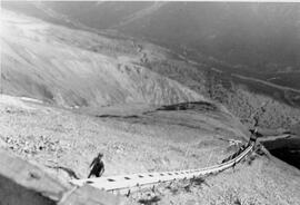Photograph depicts ore gravity chute on McDame Mountain, man walking uphill, mine valley in background.
