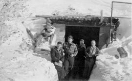 Photograph depicts four men standing in doorway of log shelter built into mountainside. Men standing in path leading to doorway, snow at elbow height on either side. Shelter is speculated to be a portal to a mine adit.